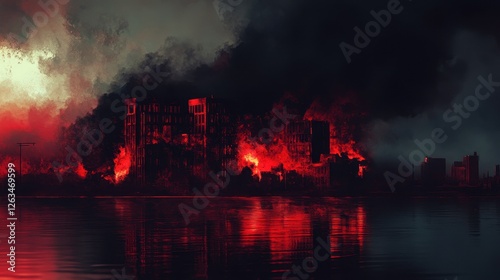 Obraz premium Burning city skyline reflected in dark water below