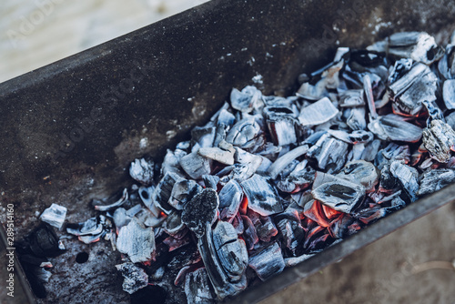 Obraz premium Burning coals in the grill. Shallow depth of field.
