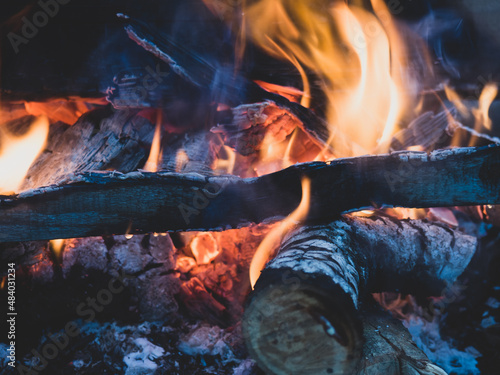 Fototapeta premium Burning fire. The fire burns in the forest. Texture of burning coals. Campfire for cooking in the forest. burning dry branches.