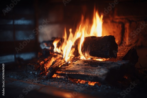 Fototapeta premium Burning Fireplace with Flames and Glowing Embers, Cozy Warmth.