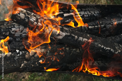 © boomeart, Fototapeta premium Burning firewood in the fire outdoor