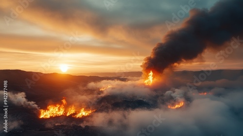 © sawitreelyaon, Obraz premium Burning garbage in a foggy park at twilight, with the sun setting behind thick mist.