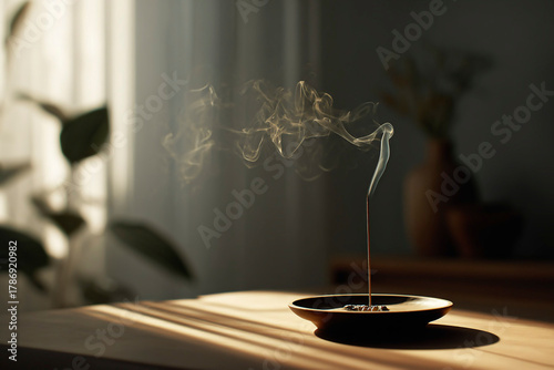 Obraz premium Burning Incense Stick with Rising Smoke in Warm Sunlight