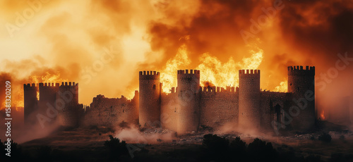 © Vergiliy, Fototapeta premium Burning medieval castle engulfed in flames during dramatic sunset.