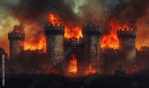 Fototapeta premium Burning medieval castle engulfed in flames with dramatic sky and smoke
