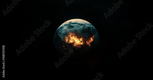Naklejka premium Burning planet Earth in space, explosion and fire effects, dark background