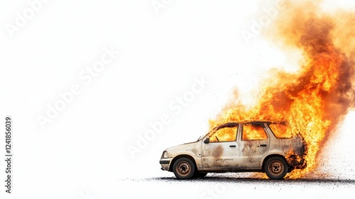 © Newleks, Obraz premium Burning white vehicle engulfed in intense orange flames, dark smoke rising against pristine white backdrop, highlighting destructive automotive incident