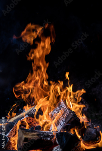 © Jag_cz, Fototapeta premium Burning wooden logs in fire, campfire on black