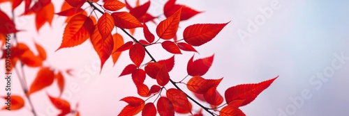 Fototapeta premium burnt orange and deep red leaves against a soft blue and pink gradient, pink...