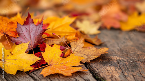 © Julia, Obraz premium Burnt Orange Autumn Leaves Pile in Soft Sunlight