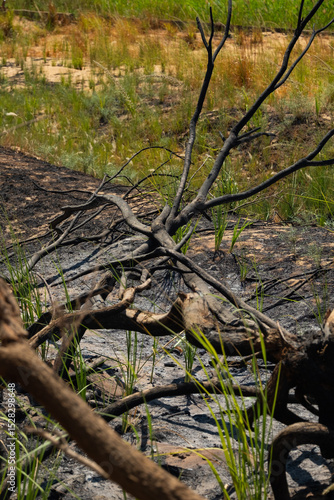 © VasylisaDvoichenkova, Fototapeta premium Burnt tree in dry landscape, symbol of climate change, deforestation, and environmental crisis