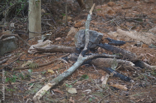 © Bruno, Fototapeta premium burnt tree on the ground next to a rock