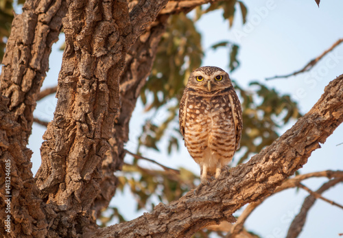 Obraz premium burrowing owl on tree branch looking at camera.