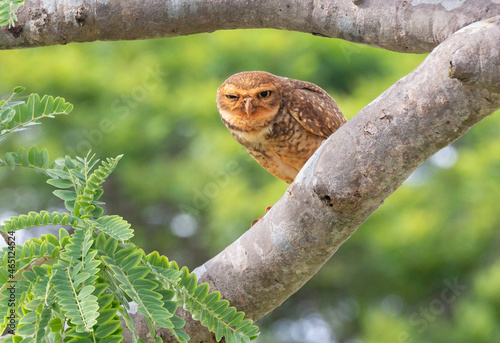 © Adilson, Obraz premium Burrowing owl perched on a tree branch. in selective focus