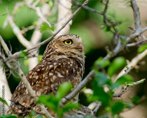 Fototapeta premium Burrowing owl sideways perched on a tree, over green blurred vegetation...