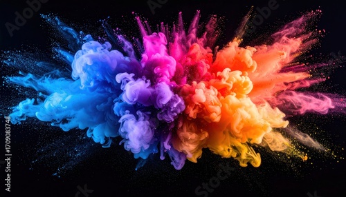 Fototapeta premium Burst of vibrant pigments expands against black backdrop. Hues range from...