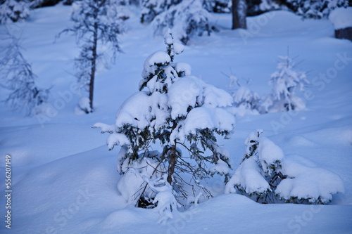 © Vedrana, Fototapeta premium Bush covered with snow against snowy landscape