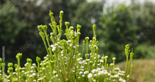 Fototapeta premium Bush, nature and white flowers outdoor for growth, botany and blossom in garden ecosystem. Natural beauty, plants and meadow with petals, floral environment or fynbos in bloom in spring on background