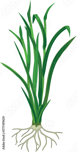 Naklejka premium Bush of green grass wiyh roots isolated on white background.