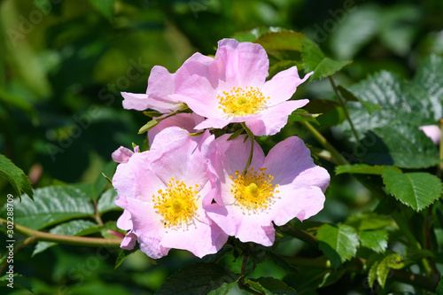 Fototapeta premium Bush with pink roses and green leaves in a garden in a sunny summer day