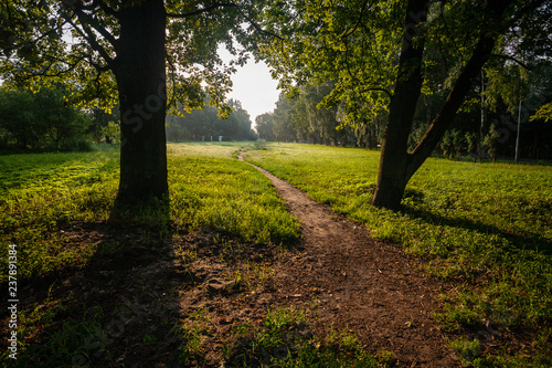 Obraz premium bushes and trees in autumn mist in green meadow