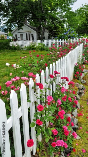 Fototapeta premium bushes of tender, blooming roses lining a white picket fence.