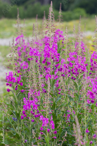 © Tatiana Foxy, Naklejka premium Bushes of willowherb on geen field in the summertime