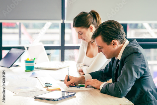 Obraz premium Business analyst team using laptop for financial insight with Fintech paper...