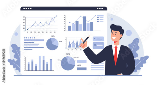 © Ophelia, Fototapeta premium Business analytics presentation with graphs and charts for data analysis and strategy planning vector illustration
