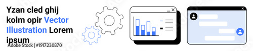 Fototapeta premium Business analytics, technology interface, communication tools, productivity, digital teamwork, workflow. A gear, bar graph and chat windows. Business analytics and technology interface concept