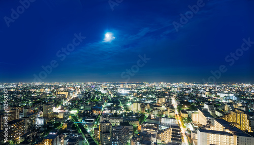 Fototapeta premium Business and culture concept for real estate and corporate construction - panoramic modern city skyline bird eye aerial night view under dramatic neon glow and beautiful dark blue sky in Tokyo, Japan