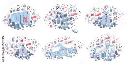 © Sylverarts, Fototapeta premium Business and finance concepts 3D vector illustrations set isolated on white background, money theme conceptual design collection, savings, bank, contract, income, safety, online.