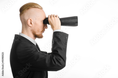 © Alex, Fototapeta premium Business and search topic: Man in black suit holding a black binoculars in hand on white isolated background in studio