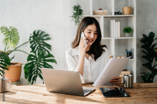 © Nuttapong punna, Fototapeta premium Business asian woman Talking on the phone and using a laptop with a smile while sitting at home office