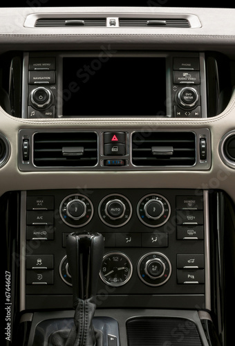 © alexdemeshko, Fototapeta premium Business car interior. Screen multimedia system.
