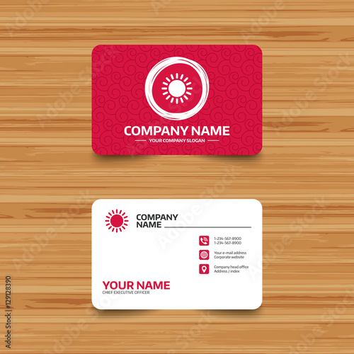 Fototapeta premium Business card template with texture. Sun icon. Sunlight summer symbol. Hot weather sign. Phone, web and location icons. Visiting card Vector