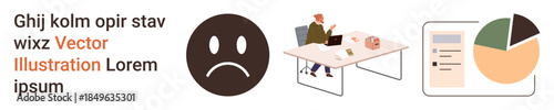 Fototapeta premium Business challenges, workplace stress, data analysis, office productivity, reporting, problem-solving. Sad face icon, man working at desk pie chart document. Business challenges and workplace
