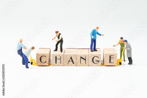© Nuthawut, Obraz premium Business change, transform or self development for success concept, miniature people figure, workers, employee staffs help move wooden stamp block to arrange the word CHANGE on white background