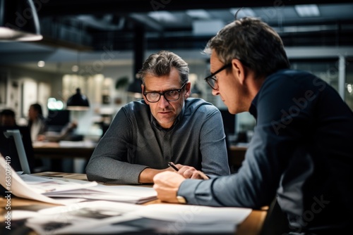© blvdone, Fototapeta premium Business colleague people discussing blueprint at a table