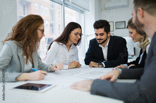 © NDABCREATIVITY, Obraz premium Business colleagues collaborating and discussing project plans