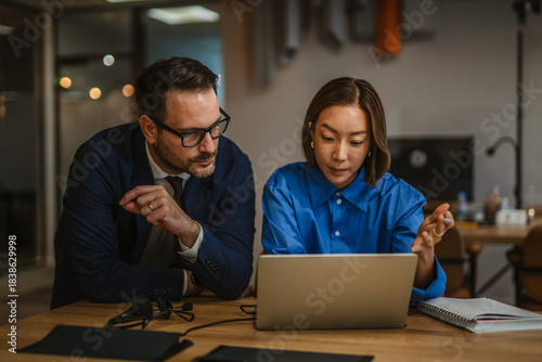 Fototapeta premium Business colleagues collaborating on laptop in modern office