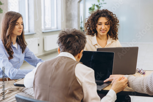 Obraz premium Business colleagues collaborating on laptops, discussing strategy during team meeting in modern office workspace