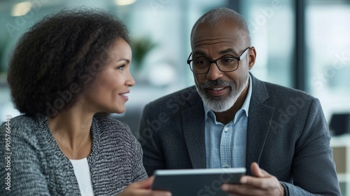 © prem, Fototapeta premium Business Colleagues Discussing Project on Tablet