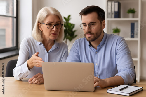 © SentiStock, Obraz premium Business colleagues review project on laptop collaborating on a strategy professional teamwork office setting