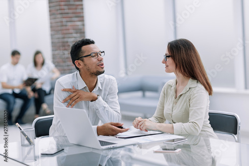 © yurolaitsalbert, Obraz premium business colleagues talk sitting at the office Desk