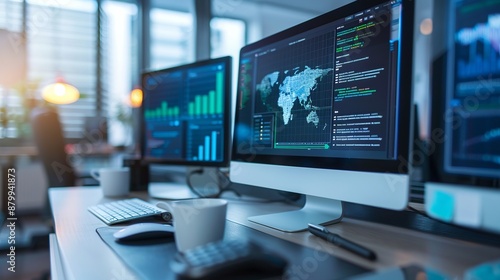 Fototapeta premium Business computer system is receiving updates online. Software upgrade is in...