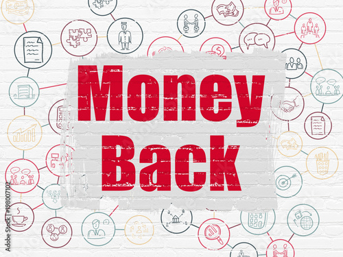 Fototapeta premium Business concept: Painted red text Money Back on White Brick wall background with Scheme Of Hand Drawn Business Icons