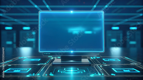 Fototapeta premium Business continuity concept. A futuristic, digital workspace featuring a glowing monitor and holographic interface in a technology-driven environment.
