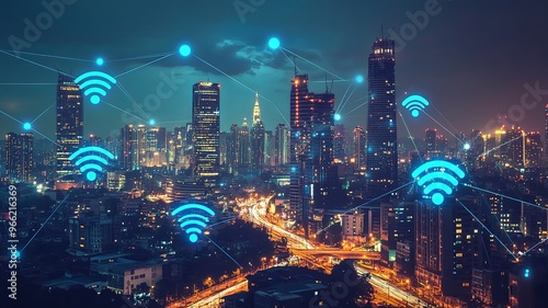 © KKK 999, Fototapeta premium Business district and wireless technologies