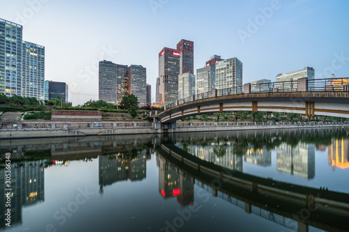 © hallojulie, Naklejka premium Business district office buildings and water reflection in Beijing at night